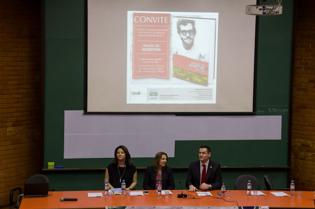A mesa de abertura do evento contou ainda com as presenças da reitora Márcia Abrahão e do vice-reitor Enrique Huelva. “Neste 55 anos da UnB, resolvemos trazer à memória esta pessoa marcante para a Universidade que foi Honestino”, destacou Huelva. Em seguida, a reitora parabenizou a EDU pela sensibilidade demonstrada ao publicar o livro. “Como ex-aluna de Geologia, considero que não poderíamos deixar de falar de Honestino”, disse.