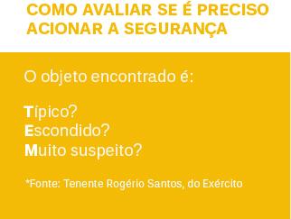 “Tudo o que vocês perceberem de diferente nos ambientes que estão acostumados a frequentar deve ser reportado a alguém da segurança do local”, afirmou Santos. O tenente ensinou uma técnica de memorização (veja quadro) de itens básicos a serem observados quando se chega a um local, que são: perceber se um objeto encontrado é típico ou atípico naquele ambiente; se ele está escondido de alguma maneira; se é ou não algo suspeito.