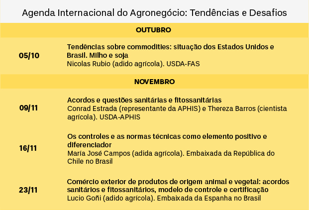Até novembro, no auditório da Faculdade UnB Planaltina (FUP), série de palestras abordará as tendências e os desafios da agenda internacional do agronegócio. Diplomatas e representantes governamentais agrícolas de seis países – Argentina, Chile, Peru, Espanha, EUA e França – e da União Europeia (UE) que realizam trocas comerciais com o Brasil falarão sobre temas que estão nas mesas de negociação. Entre eles, exigências sanitárias e fitossanitárias para o comércio de produtos agrícolas e situação das commodities milho e soja no Brasil e nos Estados Unidos.