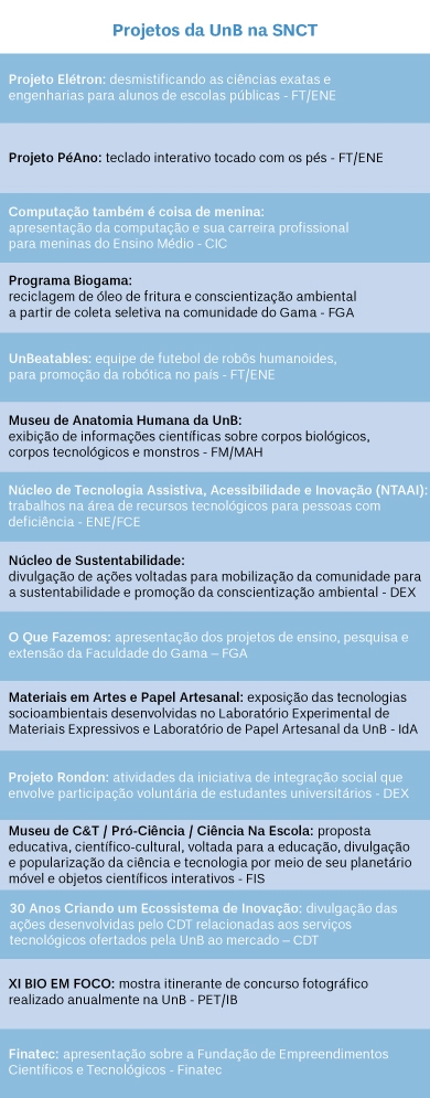A Universidade de Brasília expõe quinze projetos de cunho científico e tecnológico na Semana Nacional de Ciência e Tecnologia (SNCT). Em Brasília, o evento ocorre no Pavilhão de Exposições do Parque da Cidade, entre 19 e 25 de outubro.