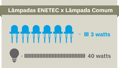 "A lâmpada é criação da Enetec", orgulha-se Pedro. "Uma lâmpada comum gasta 40 watts", compara.