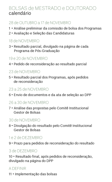 O processo terá continuidade nos programas, com divulgações de resultados parciais do julgamento das candidaturas apresentadas e pedidos de reconsideração, e, dos dias 23 a 25, os documentos dos aprovados serão encaminhados ao decanato de Pesquisa e Pós-Graduação (DPP) junto com a ata de seleção de cada programa. Ali, o Comitê Institucional Gestor de Bolsas, formado por representantes das três grandes áreas do conhecimento (Ciências da Vida, Ciências Exatas e da Terra, e Ciências Humanas), analisará as propostas, entre 26 e 30 de novembro. O resultado final será divulgado na página eletrônica do DPP no dia 3 de dezembro.