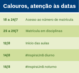Os calouros estão convidados a participar da aula inaugural #InspiraUnB, momento de acolhimento a ingressantes, docentes e estudantes que retornam às atividades. Para estudantes de curso diurno o #InspiraUnB será no dia 14 de agosto, e para o noturno, no dia 15 de agosto. A programação completa estará disponível em breve na página de boas-vindas.