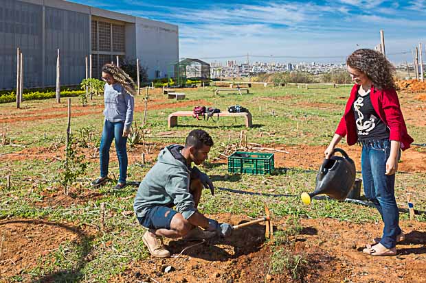 Na área verde que separa dois blocos do campus da UnB em Ceilândia, alunos do curso de Farmácia cuidavam do jardim medicinal, projeto implementado no local no início do ano. “Teremos maracujá, boldo, babosa, alecrim, hortelã, guaco e outras plantas para fazer chá, xarope, sabonetes e xampus. Ofereceremos também palestras, oficinas e outras atividades com o intuito de envolver a comunidade nesta construção”, conta o estudante Vanderson Stanley.