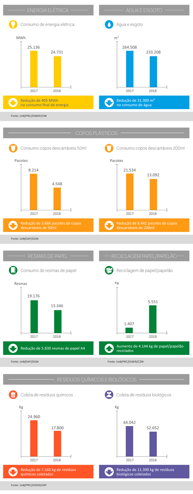 Na perspectiva ambiental, progressos estão registrados na avaliação do primeiro ano de implementação do Plano de Logística Sustentável (PLS), disponível no relatório. De 2017 para 2018, houve queda no consumo de energia elétrica, água e esgoto, copos plásticos e outros insumos, consequência do desenvolvimento de ações para estimular o comportamento sustentável entre a comunidade acadêmica (veja o gráfico).
